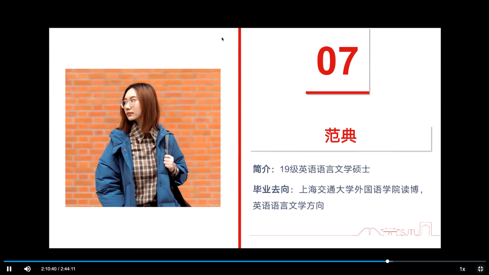来自外国语言文学专业的范典选择继续在本院攻读博士学位。她分享了自身明确读博目标的心路历程,提醒同学们要与意向导师进行充分沟通,认真思考和制定自己博士期间的学习科研计划。