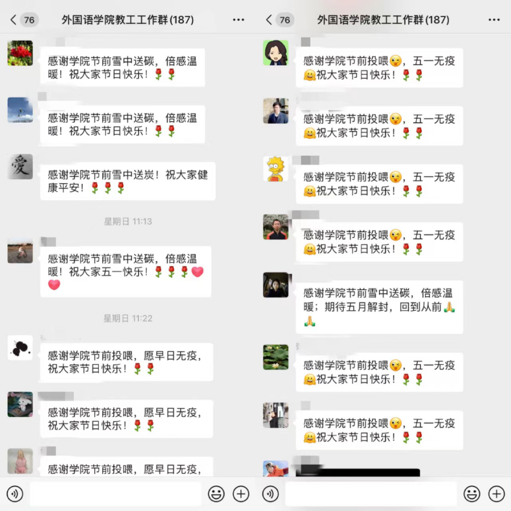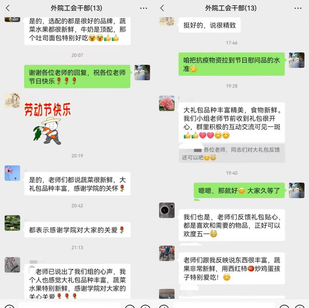 陆续收到爱心大礼包的教职员工们纷纷感谢学院及时、暖心、贴心的关怀!在疫情防控的关键时刻,外院人凝聚一心,众志成城,各守一方,期待花开疫散、校园相见的那一天早日到来!