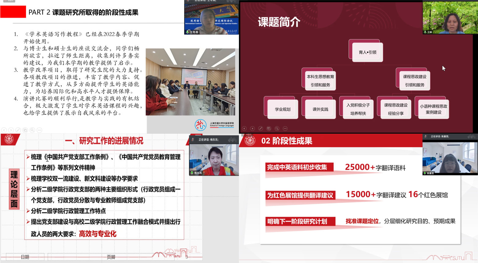 各课题负责人分别从研究进展、取得的阶段性成果和下一阶段研究计划三个方面对研究课题进行汇报。四个立项课题涉及支部建设与业务工作的融合研究、党员教师在教书育人中的引领作用、红色展馆中英翻译传播研究等方面。研究工作将党的理论与调研、实践相结合,积极发挥了党建引领作用,并有效支持了日常学习、学科建设和管理工作的开展。