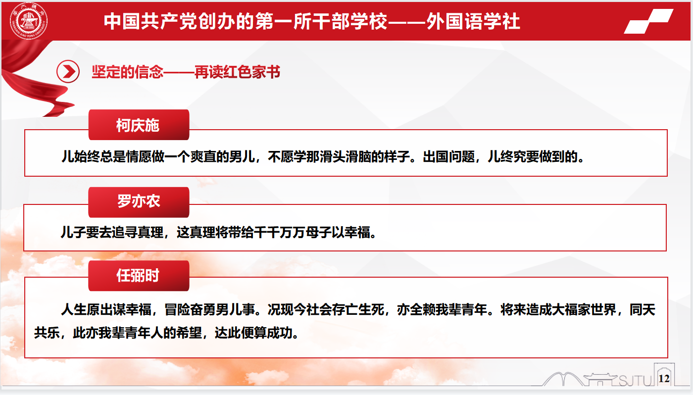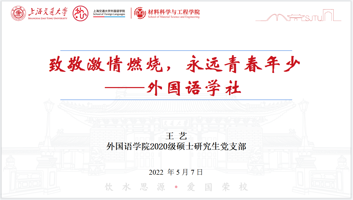 随后,外国学院2020级硕士党支部书记王艺为两支部成员介绍了共青团发展史上重要机构——外国语学社。王艺从上海社会主义青年团和外国语学社成立的时代背景、领导团队、发展历程出发,介绍了共青团成立初期与党组织的密切关系以及外语在培养党团人才方面发挥的重要作用。同时,她也分享了党支部2021年暑期社会实践访问共青团中央委员会的经历。最后,王艺结合《新时代中国青年》白皮书中对青年的期待,联系外语专业特色,呼吁交大学生尤其是外语学子,提高党性修养,锤炼过硬本领,为“讲好中国故事,传播好中国声音”作出自己的贡献。