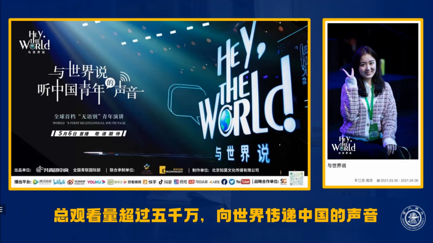 会议最后,李雨桐以“交青春答卷,担时代大任”为题,讲述了她作为中华全国学生联合会执行主席,在共青团中央宣传部的学习经历。李雨桐从自己协助策划制作“青年学党史,百问出真知”学习小程序、“HEY THE WORLD”节目、主持青年大学习等活动出发,分享了许多精彩故事,让大家切身感受到中国青年与时代同行的青春脉搏。最后李雨桐寄语大家,胸怀世界、勇挑重担,“让祖国看到交大青年的样子、让世界看到中国青年的样子”。