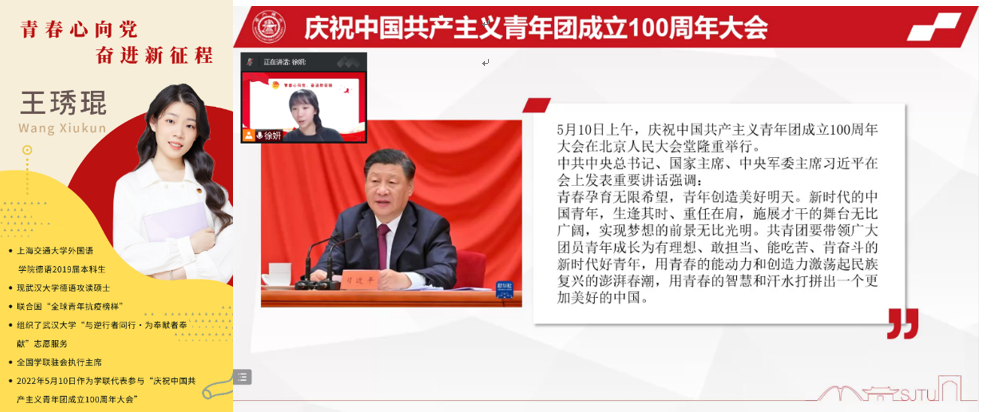 王琇琨,2019年本科毕业于开元网页版德语系,现在武汉大学德语系攻读硕士,曾被评为联合国“全球青年抗疫榜样”,现任全国学联驻会执行主席。2022年5月10日,王琇琨作为全国学联代表参加了“庆祝中国共产主义青年团成立100周年大会”,现场聆听总书记重要讲话。徐妍简要介绍活动背景、嘉宾信息,带领大家观看习近平总书记重要讲话的回放。