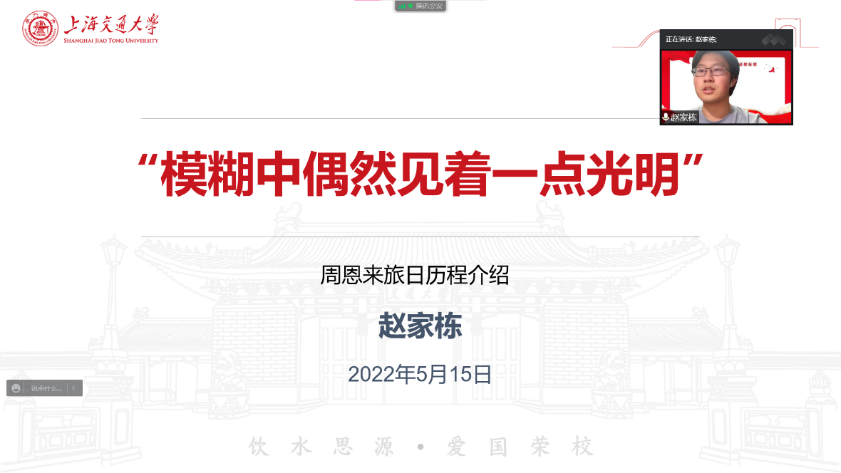 随后,团支部组织委员赵家栋以“模糊中偶然见着一点光明”为题,为大家讲述了周恩来总理的留日历程。赵家栋从学习历程、社会认知、思想变化、时代价值四个方面,生动地分享了周总理的留学故事,也鼓励团员青年们在学习态度和思想觉悟上向周总理看齐,既要学好专业知识,也要勇担历史责任。