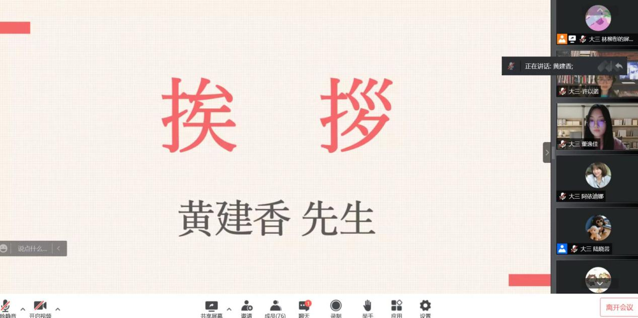 在演讲比赛开始之前,由黄建香老师致开幕词。黄建香老师在讲话中分享了个人的孤独体验。在疫情期间居家隔离,行动受限的孤独状态下,黄老师体会到了繁忙的都市停摆后,另一种更加贴近自然的生活方式的魅力;感受到了平日素不相识的邻里之间守望相助的温情。黄老师的讲话唤起了参赛同学与参会观众深深的共鸣和启迪。
