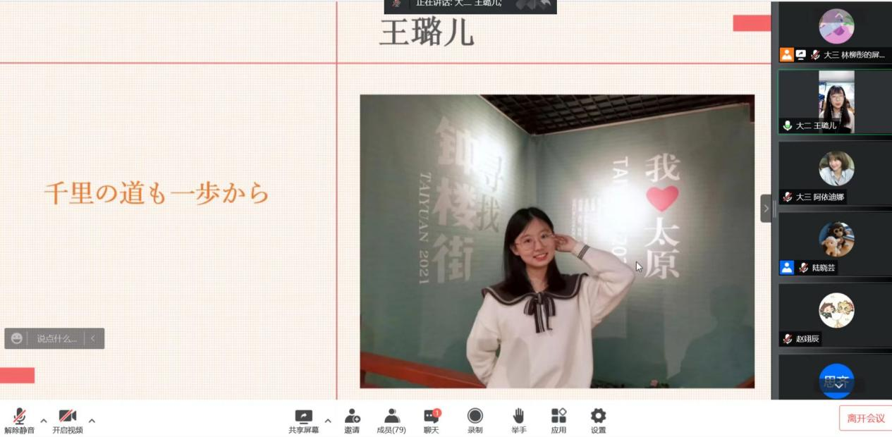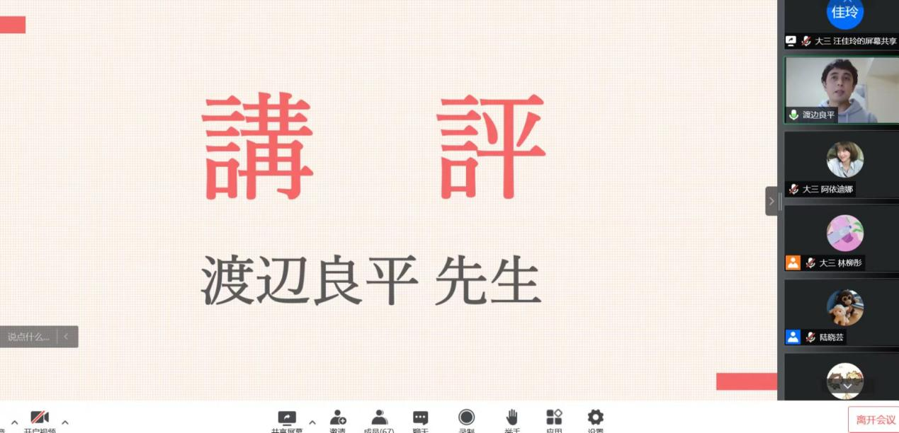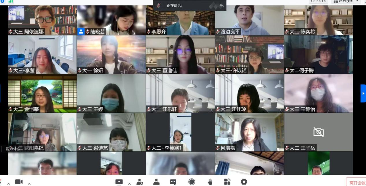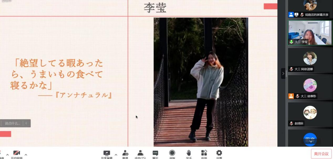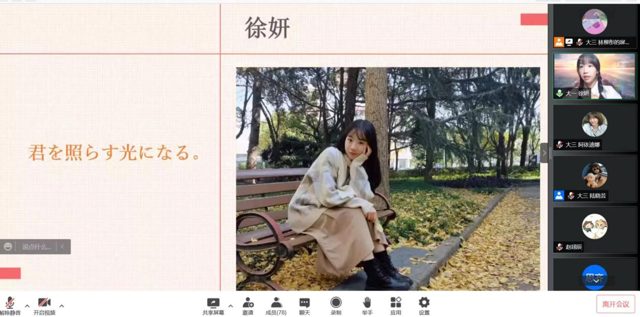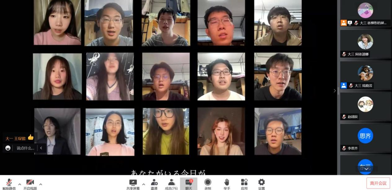 日语系大一大二同学的表演环节穿插其间,大一同学合唱了日语歌曲《在我心中》,大二同学排演了课本剧《望月物语》。由于本次演讲比赛在线上举办,两个节目都是提前录制完成。动人的表演展现了交大学子的精神面貌与风采,观众在会议聊天窗口积极互动,现场反响热烈。
