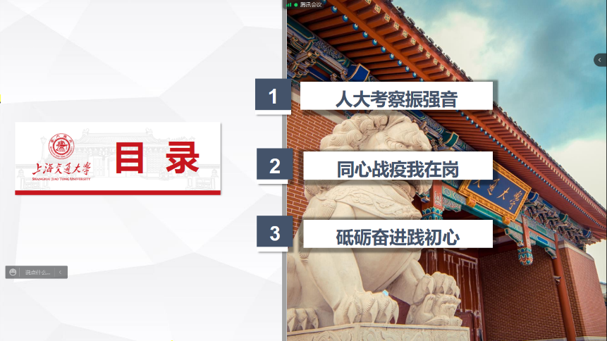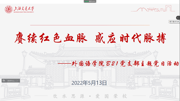 接着,组织委员王慧进行主题为“传承百年辉煌,奉献青春力量”的微党课分享,围绕中国共青团成立100周年,结合自身抗疫志愿经历,展现交大青年的担当与力量。她回顾了中国共青团从新民主主义革命时期发展至今的百年历程,带领大家重温这段光辉历史。她结合今时今日的交大防疫生活动态挖掘交大青年的使命担当。结合自己担任楼层层长以及秩序维护志愿者的经历及同学们在疫情之下依然保持励志求学、不懈努力的进取精神,强调青年需具备热爱集体的奉献精神、奋发向上的求知精神。“星星之火,可以燎原”,在分享的结尾,她以这句毛泽东的名言呼吁大家砥砺前行、众志成城,奉献青春力量,传承百年辉煌。她坚信,“东方风来满眼春”。在交大力量、交大温度和交大速度的助力下,在全体交大人的齐心守护下,全面胜利定会早日到来。