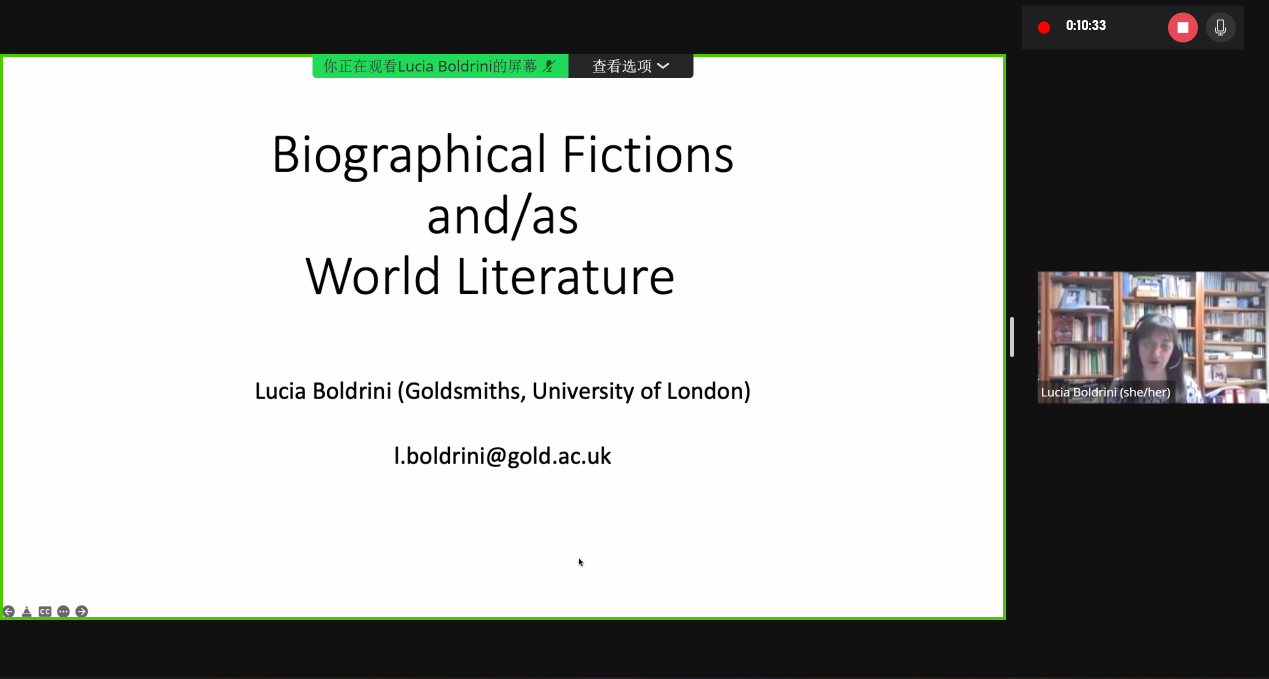 2022年5月25日,英国伦敦大学金史密斯学院教授、欧洲科学院院士、国际比较文学协会副主席露西娅·博尔德里尼(Lucia Boldrini)应上海交通大学开元网页版的邀请,给外院师生做了题为“作为世界文学的传记小说”的线上讲座。本次讲座由上海交通大学开元网页版尚必武教授主持。
