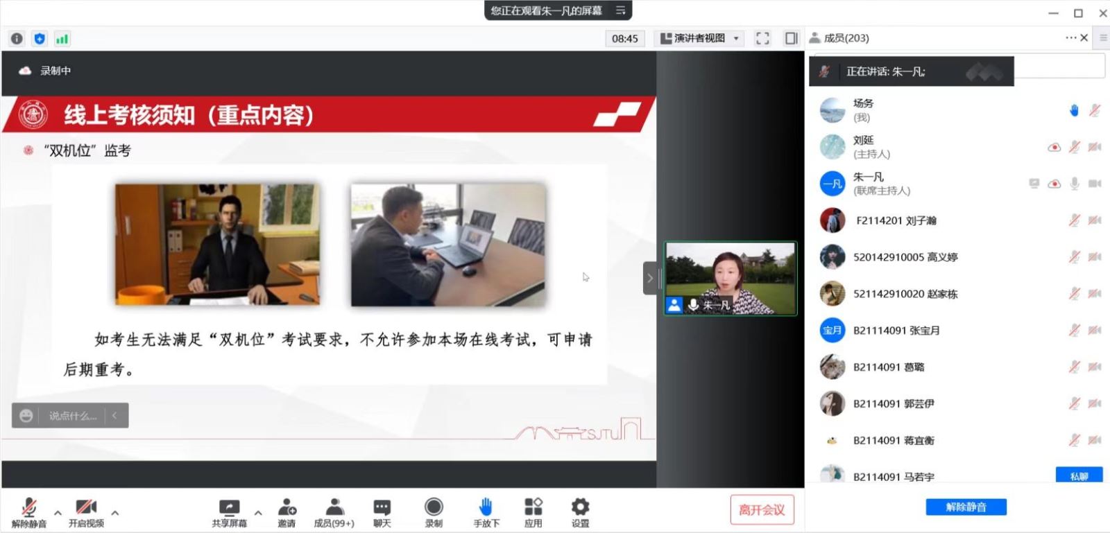 会上,朱一凡肯定了同学们求真务实的学习态度和诚实守信的精神品质,并就考核形式和考场纪律进行重点强调。她谈到,本次期末考试将通过线上平台进行,针对学生在校、在家两个情景设置不同方案,考核形式较往年而言相对特殊,因此同学们更要打好提前量、把好时间点,仔细阅读考核须知,根据自身情况做好考前申请、设备调试等准备工作。她强调,期末考试是综合检验学习成果的难得机会,也是及时诊断学习问题、调整学习状态的转折契机,希望同学们以审慎严肃的态度和饱满的精神状态迎接考试,在复习阶段夯实基础、查漏补缺,注意劳逸结合,认真备考、踏实应考,延续优良考风,交出诚信答卷。