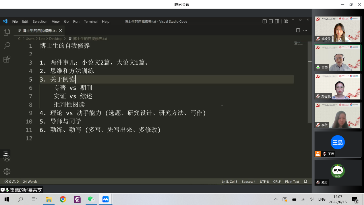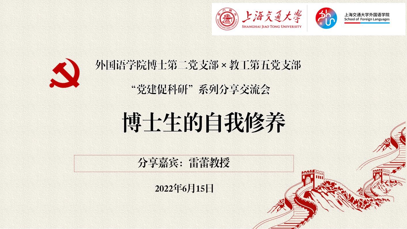 6月15日下午,开元网页版博士第二党支部联合教工第五党支部开展“党建促科研”系列分享交流会第二期活动。本次活动邀请雷蕾教授做题为“博士生的自我修养”的专场分享,三十余名学生党员、入党积极分子等同学参加本次活动。活动由博士第二党支部组织委员彭思源主持。