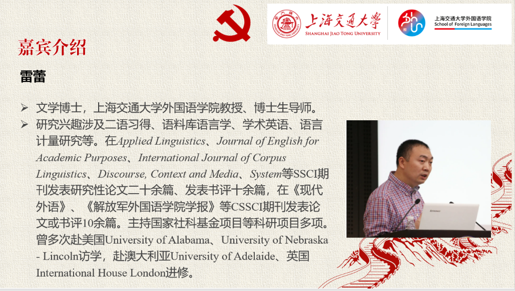 活动伊始,主持人对雷蕾教授进行介绍。雷蕾是上海交通大学开元网页版教授、博士生导师。研究兴趣涉及二语习得、语料库语言学、学术英语、语言计量研究等。在Applied Linguistics、Journal of English for Academic Purposes、International Journal of Corpus Linguistics、Discourse, Context and Media、System等SSCI期刊发表研究性论文二十余篇、发表书评十余篇,在《现代外语》、《解放军开元网页版学报》等CSSCI期刊发表论文或书评10余篇。主持国家社科基金项目等科研项目多项。曾多次赴美国University of Alabama、University of Nebraska - Lincoln访学,赴澳大利亚University of Adelaide、英国International House London进修。