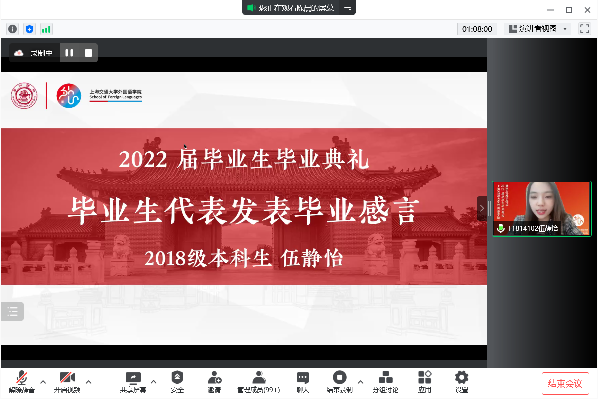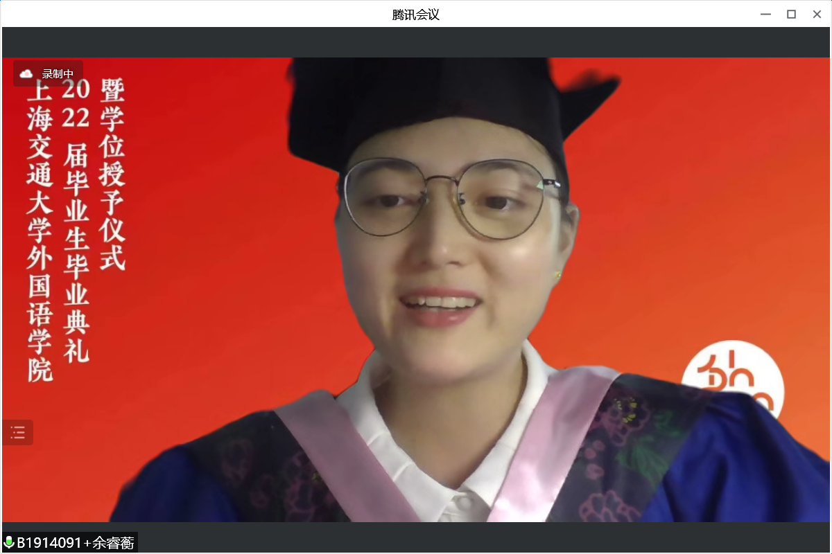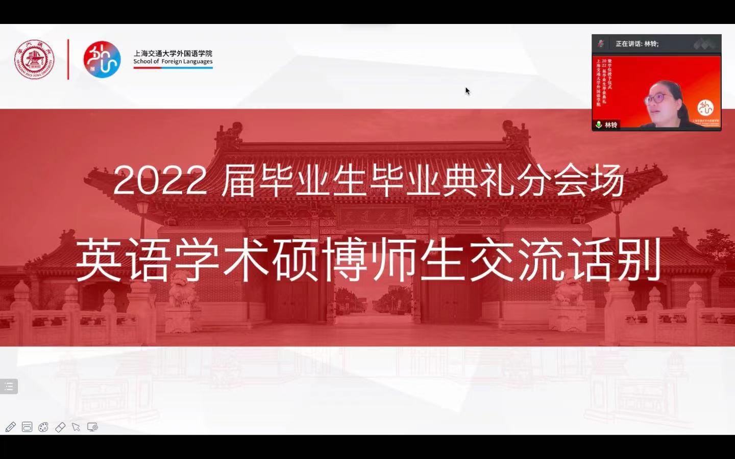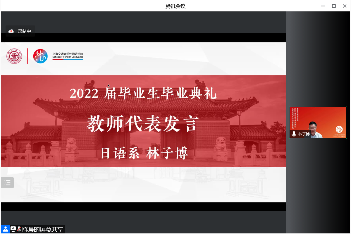日语系林子博作为教师代表寄语毕业生。他以自己学生时代缺席博士毕业典礼的遗憾,告诉同学们在疫情大变局中要学会坦然接受,并坚守自己的责任与担当。林子博希望毕业生们常思在交大外院辛勤耕耘的日日夜夜,常忆青春时代为幸福生活的不懈奋斗,让这份热爱与冲劲替代内卷的迷茫,找到属于自己的星辰大海。