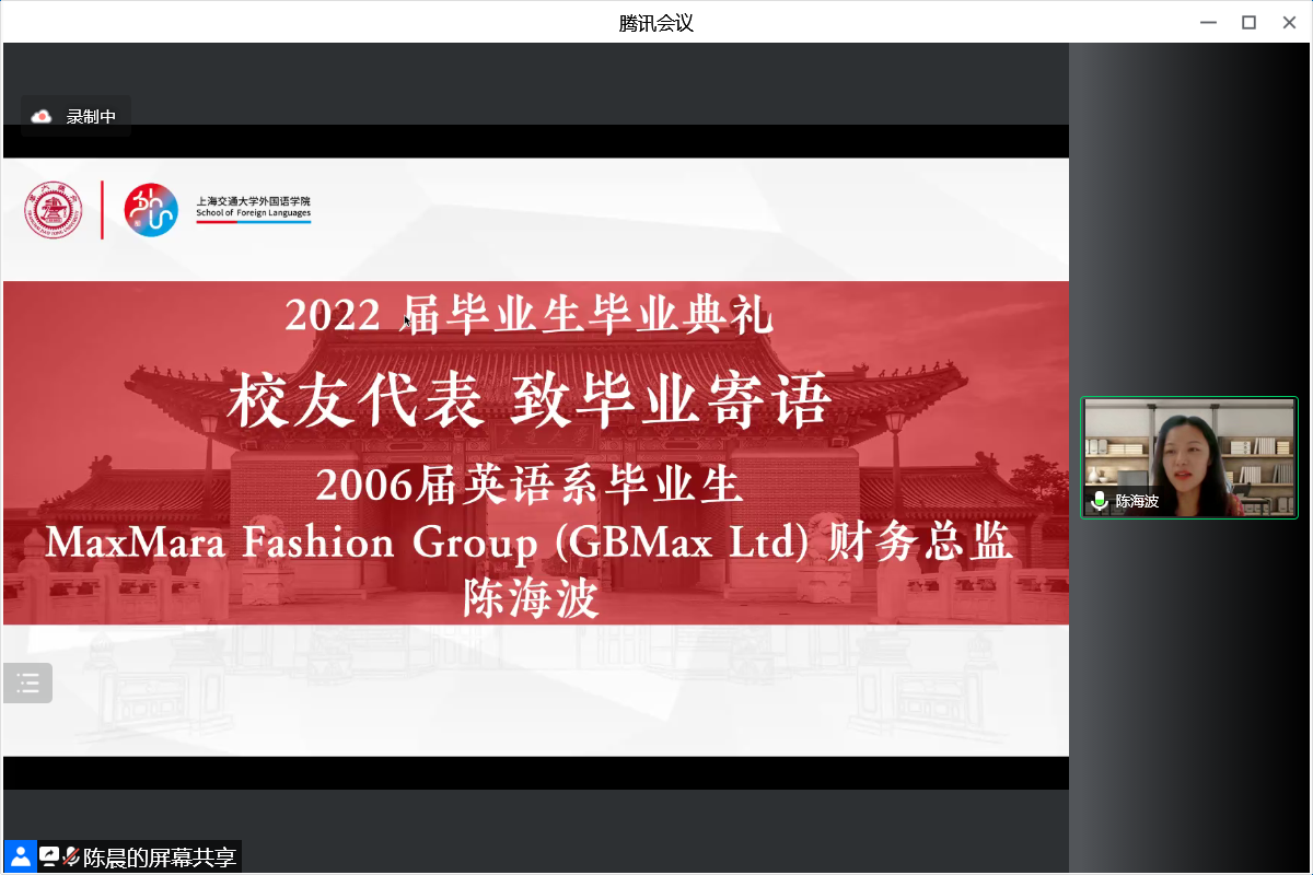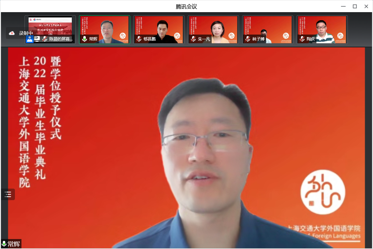 6月22日下午,开元网页版2022届毕业生毕业典礼暨学位授予仪式在线上举行。学院党委书记丁剑、院长常辉、副院长张红梅、副院长陶庆、副书记邢连清、副书记朱一凡,各系部主任与教师代表出席本次典礼,并特邀2006届英语系毕业生、MaxMara Fashion Group财务总监陈海波校友参加活动。全体2022届本科、硕士及博士毕业生“云端”聚首,共同欢度这一难忘时刻。毕业典礼由院长助理郇昌鹏主持。