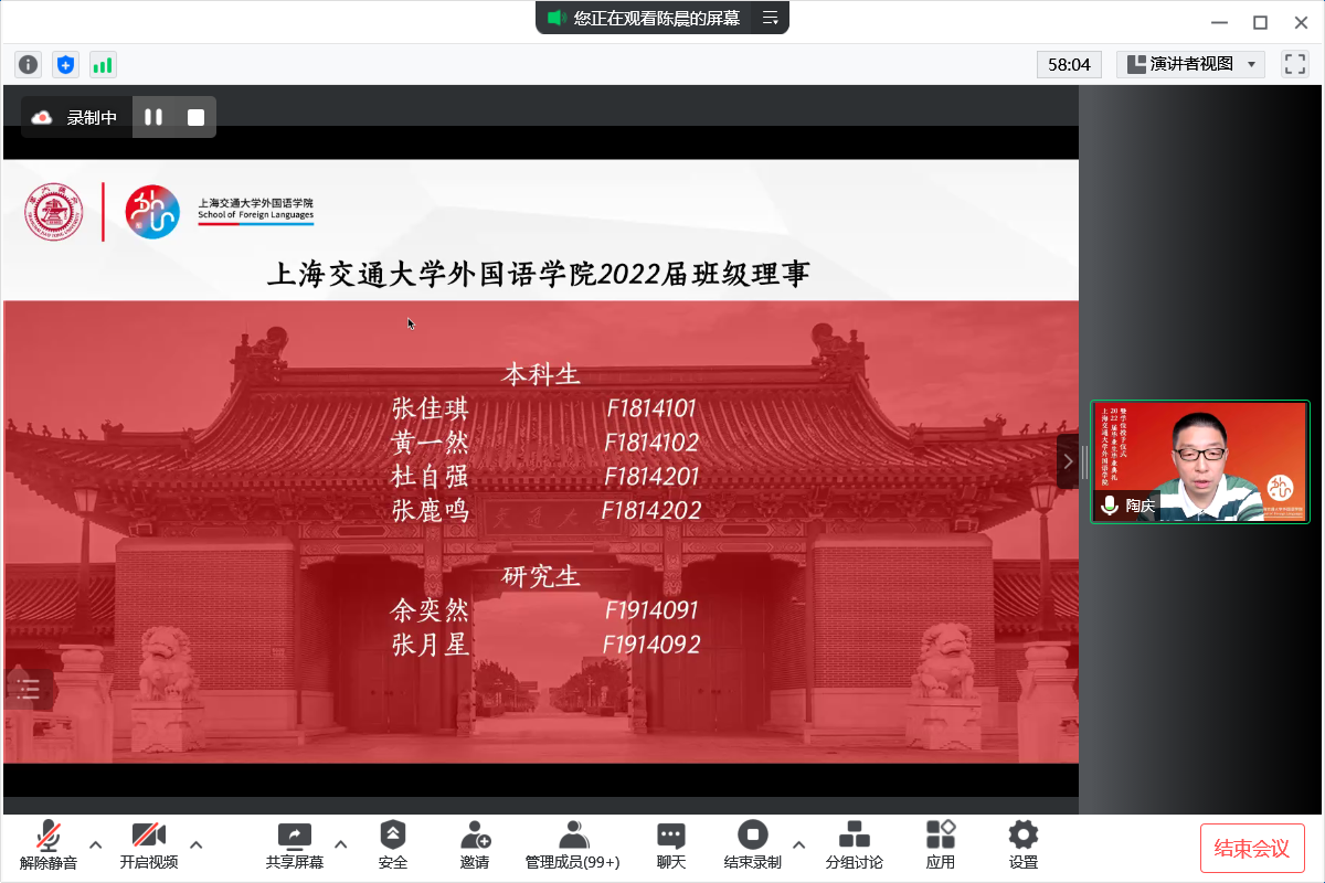 “班级理事”是学校和学院联系校友的亲密纽带。为让外院大家庭真正成为大家绵延一生的情愫,开元网页版历来高度重视“班级理事”的聘任工作。值此惜别时分,陶庆宣读2022届班级理事聘任名单,叮嘱毕业生们接续拼搏、联络不断,学校、学院将一直关注并陪伴毕业生们的成长成才。