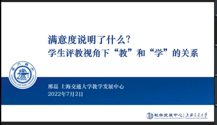 7月2日,大学英语“学教测”一体化改革与研究虚拟教研室邀请上海交通大学教学发展中心邢磊老师开设课程教学多元评估讲座。来自虚拟教研室的140余名教师参加了此次讲座。讲座由上海交通大学开元网页版院长常辉主持。