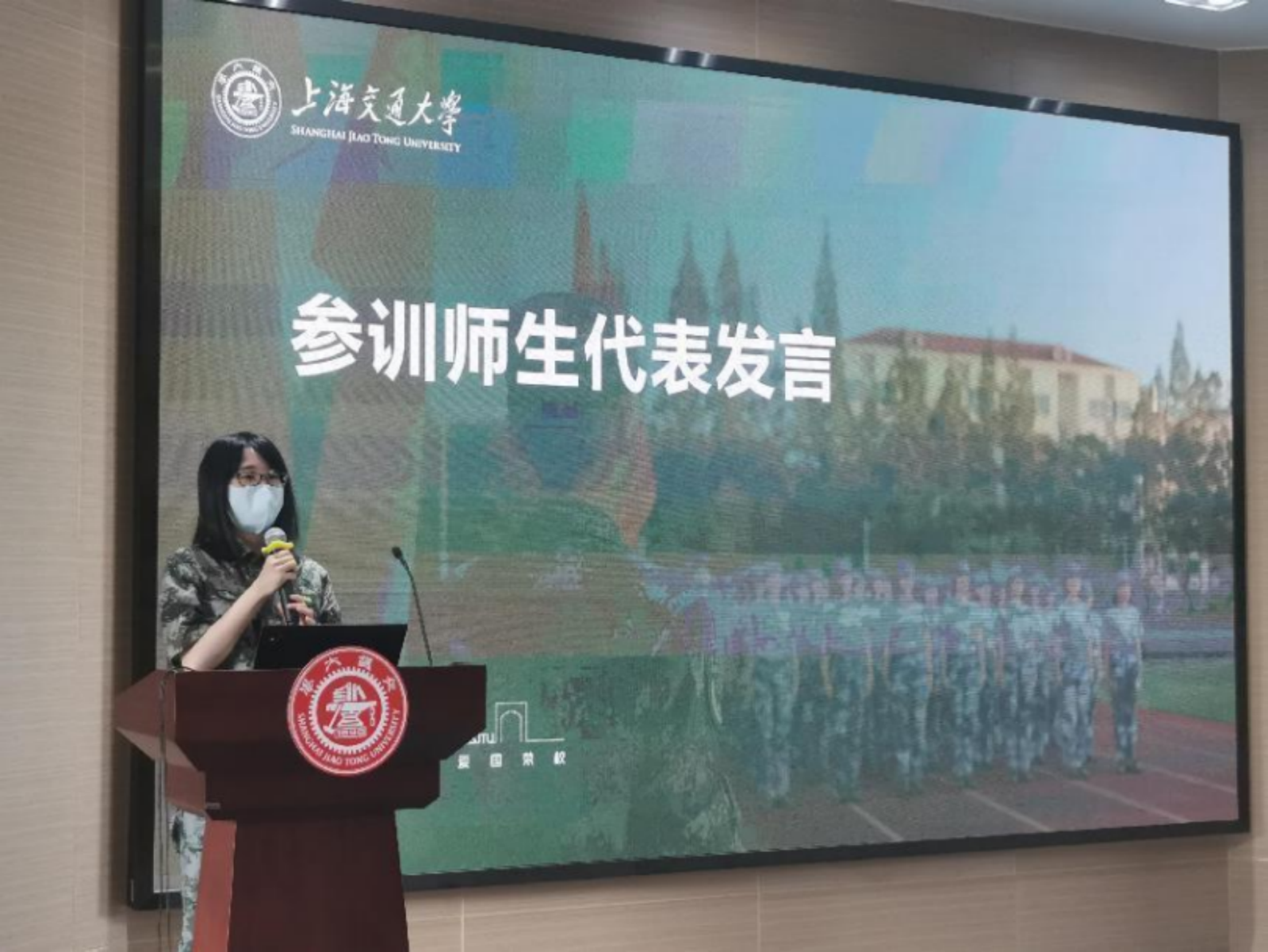 青年教师杨翕然代表参训教师发言,她谈到作为五营参谋,在本次军训活动中主要负责梳理学生数据等日常工作,在疫情防控的背景下,保障全体师生健康,为同学们训练做好后备力量。通过日复一日的细致工作,真切认识到师生同训、齐心协力的深刻意义。