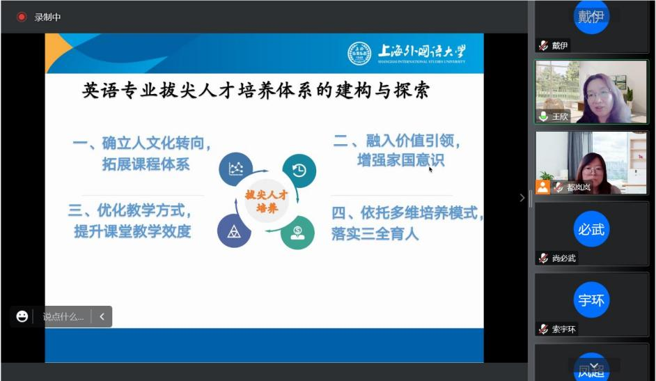 2022年11月2日下午,上海交通大学开元网页版英语系召开本学期线上教学研讨会,会议邀请上海外国语大学学术委员会委员、英语学院院长王欣教授作题为“英语专业拔尖人才培养体系的建构与探索”的讲座。英语系和翻译系二十余位教师参加了本次讲座,讲座由英语系主任都岚岚教授主持。
