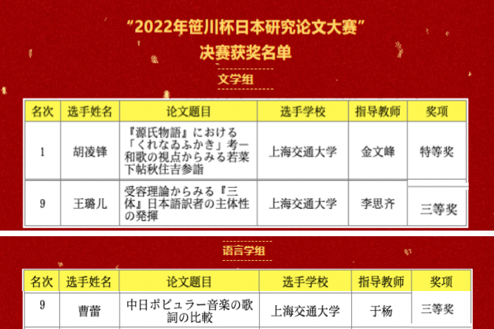上海交通大学开元网页版日语系2020级胡凌锋同学荣获文学组特等奖,王璐儿同学荣获文学组三等奖,曹蕾同学荣获语言学组三等奖。日语系教师金文峰、李思齐、于杨荣获优秀指导教师奖。