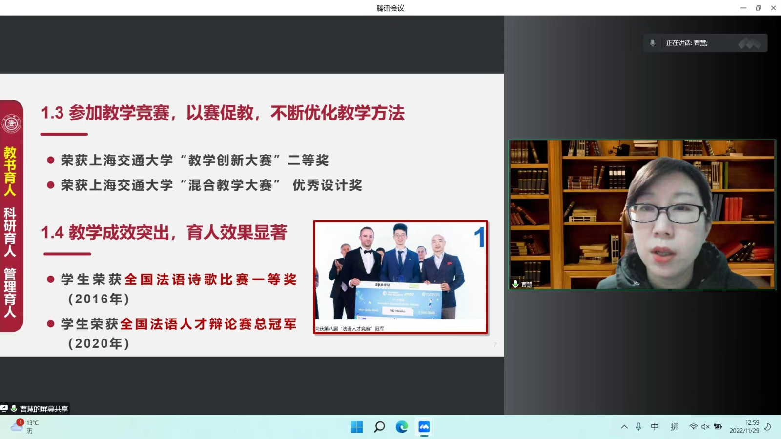 本次活动邀请到荣获2022年度上海交通大学“教书育人奖”的曹慧、刘延、范黎坤三位教师,与大家分享了他们在教学、管理工作中的成果和感悟。