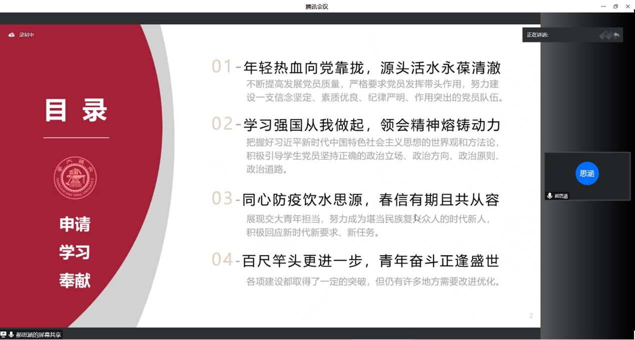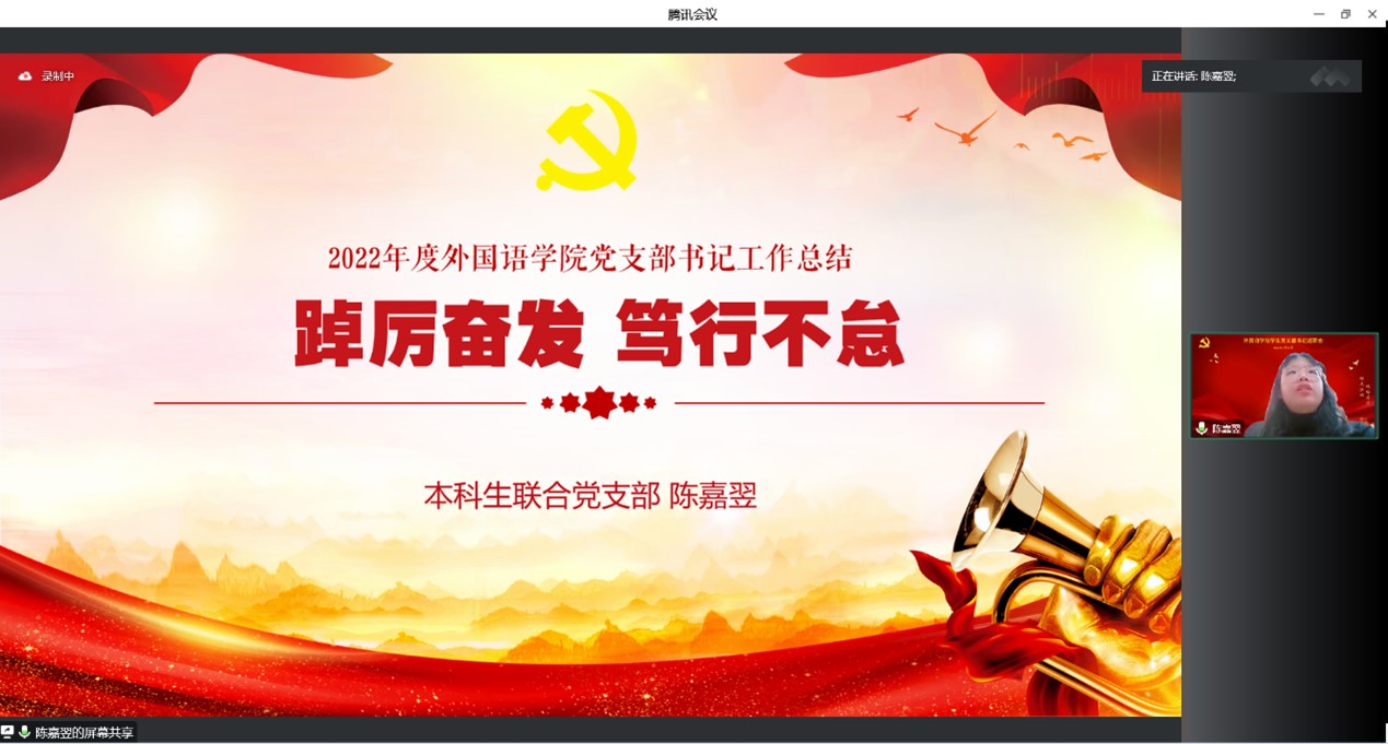 博士第二党支部书记张雅茜,博士第一党支部书记何宁,20级硕士党支部书记王艺,21级硕士党支部书记郝思涵,22级硕士党支部书记胡云豪,本科生党支部书记陈嘉翌依次就支部党务工作、党建概况、特色活动进行述职介绍。