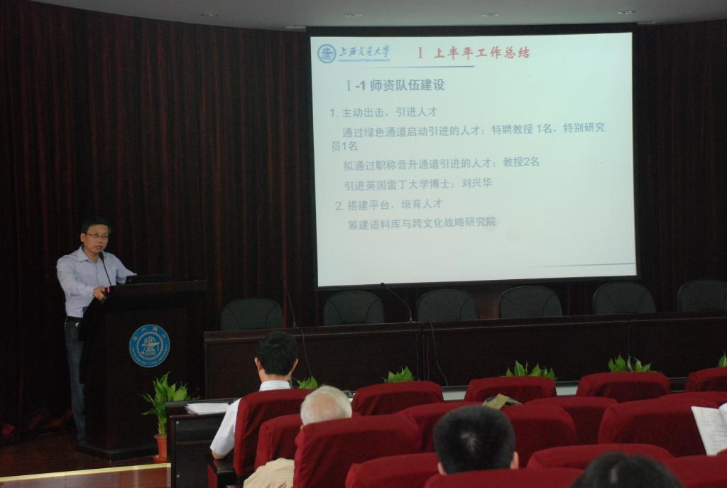 院常务副院长胡开宝教授具体就上半年学院工作做了总结并提出了下半年的工作重点。在上半年,学院在人才引进方面取得了一定进展,通过绿色通道引进特聘教授1名,特别研究员1名;在人才培养方面,涉外法律实务本硕贯通班正式招生,法语专业获批,并将于2013年开始正式招收本科生,国际化办学有了进一步的进展,新启动了与德国康斯坦茨应用科技大学双学位项目,与新加坡国立大学的合作项目,大学英语教改实验班在全校范围内取得了令人满意的教学效果;在学科建设方面,顺利完成了外国语言文学一级学科评估工作并制订了该学科的建设规划。今年暑假学院大楼也已完成了外部装修,楼宇文化建设正在完整当中。