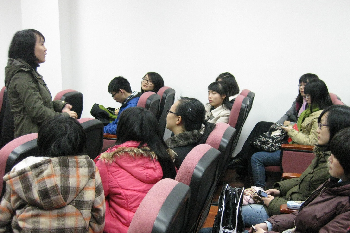 学姐们主动分享,学弟学妹们争相提问,分别提出自己的疑惑。大家积极交流,并将此次交流会推向高潮。学姐们还为第一次经历期末考试的大一同学加油鼓劲,向其讲述考试的基本形式及内容。由于现在正值选课海选,学姐们还为大家进行选课指导;为即将在明年4月份进行专业四级考试的同学介绍自己的亲身经验;并为处在过渡期的大三学生分享实习情况和就业形势。每一个疑问的解决都是在为还未经历过的学弟学妹们的进步提速,每一个经验的分享都让学弟学妹们少走弯路。
