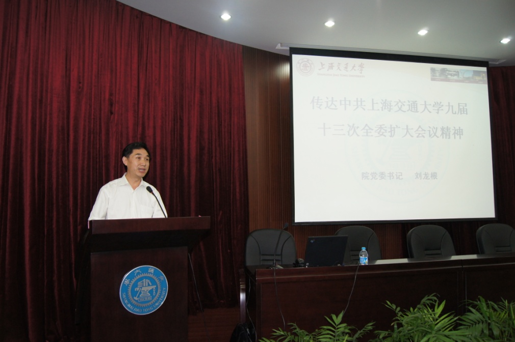 刘龙根传达了学校九届十三次全委扩大会与下半年工作部署会的精神,解读了校党委书记马德秀《改进作风,深化改革,加强推进以质量为核心的内涵式发展》的主题讲话。上半年,我校深入贯彻党的十八大精神,在人才培养、师资队伍建设、科研水平、服务社会、文化建设、党的群众路线教育实践活动等六个方面都取得了阶段性的成效;下半年,将紧密围绕作风和改革两个关键点,扎实开展党的群众路线教育实践活动,加快学校改革发展。刘龙根还介绍了本学期学院新进的教职员工,并希望全院教职员工同心同德、齐心协力,为实现学院2013年下半年工作目标而继续努力,为实现学院更好更快发展而不懈拼搏。