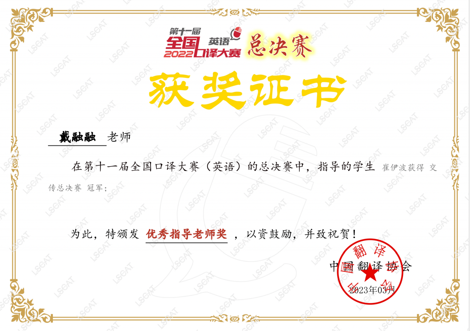 (戴融融老师-总决赛获奖证书)