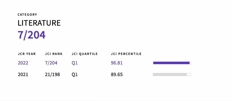 在全球53本ESCI收录的文学理论和批评期刊中,Frontiers of Narrative Studies位于Q1区间,从2021年排名全球第9跃居成为全球第2。在全球204本ESCI收录的文学期刊中,Frontiers of Narrative Studies位于Q1区间,从2021年排名全球第21跃居成为全球第7。