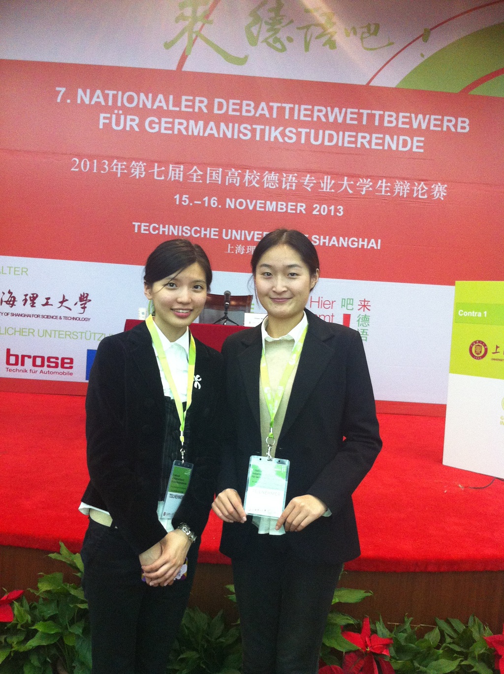 我校德语系刘晓圣和周琳妍同学在指导老师黄晓艳的带领下,代表上海交通大学参加了本届赛事。今年的比赛强手云集,竞争十分激烈。我校选手经过第一轮的激烈辩论,以优异的成绩顺利从44支代表队中脱颖而出,进入16强。在随后更为激烈、紧张的 16强比赛中,我校选手表现突出,越战越勇,成功挺进全国八强。在整个比赛中,我校的两位选手以流利的德语、充分有力的论据、敏捷的反应、出色的发挥、沉着冷静的应对战胜了一个个对手,最终以优异的成绩获得三等奖,我校选手的出色表现受到评委和观众的一致好评。