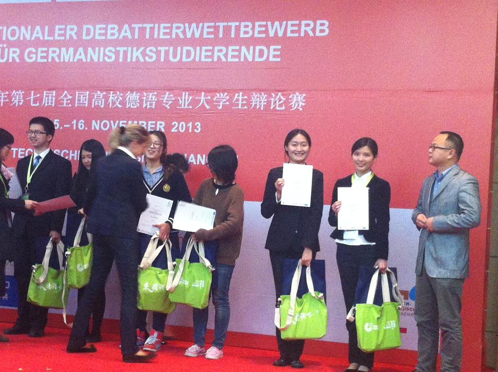 全国高校德语专业大学生辩论赛于2007年开始创办,经过7年多的努力,已经成为中国德语专业最高级别的赛事。我校在自2009年以来参加的五次比赛中, 已四次荣获团体三等奖,连续两次获得最佳辩据力奖。从全国各高校历届的比赛成绩来看,能够一直保持这样好成绩的学校在全国尚属少见。这说明我校德语专业的教学质量一直优良稳定,培养出的学生具有扎实的德语专业基础知识,灵活运用德语语言的能力和丰富的综合知识以及敏锐的思维能力和分析问题的能力。在此基础上,德语系的发展将更上一层楼。