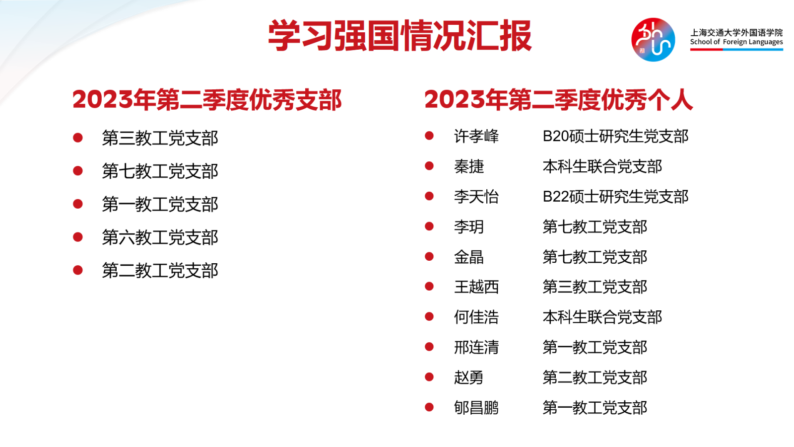 组织干事李玥就支部书记讲党课、召开专题组织生活会、党费缴纳等近期相关情况做了传达和提醒,并报告开元网页版2023年第二季度“学习强国”学习情况及第二季度“优秀支部”和“优秀个人”名单。
