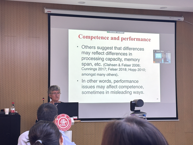 为了进一步阐释语言能力和语言表现的区别,Lydia White教授以二语习得者约束原则A和B(Binding Principle A and B)的习得为例,介绍了原则(Principles)的影响、母语的作用以及语言表征的加工。她还详细介绍了用于评估语言能力的各种离线和在线任务。