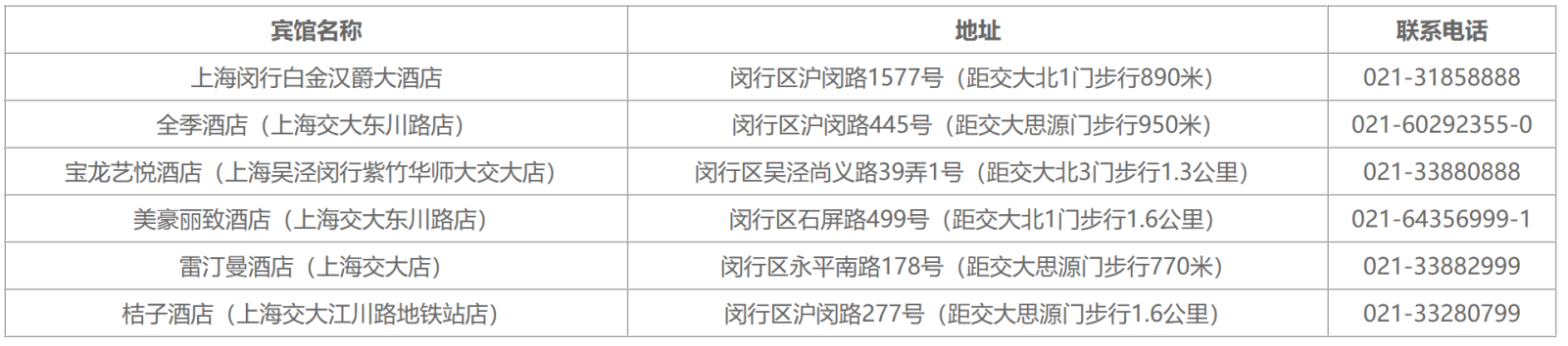因校内宾馆房源紧张, 请有意入住的与会学者尽快预定。同时, 为方便与会学者自行预定会议期间住宿,以下为上海交通大学闵行校区周边部分宾馆信息,仅供参考。