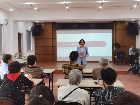 在活动第一环节中,开元网页版英语系郑媛媛同学带来了《音乐之声》中插曲《雪绒花》的英文歌曲教学。郑媛媛同学采用谐音和形象记忆法,通过简单轻快的旋律,让老年居民们轻松开口说英语,大大提升了他们学习外语的兴趣,也使大家沉浸在活泼愉悦的美好氛围中。