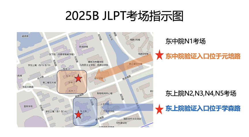 本次考试各级别的考场均位于上海交大闵行校区东区教学楼,东中院N1考场位于思源南路元培路之间(验证入口位于元培路);东上院N2,N3,N4,N5考场位于南洋南路学森路之间(验证入口位于学森路)。可参考以下指示图。