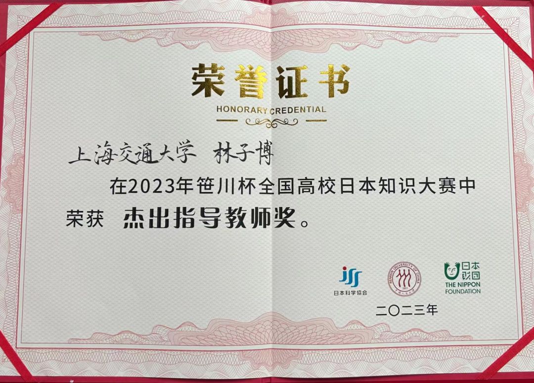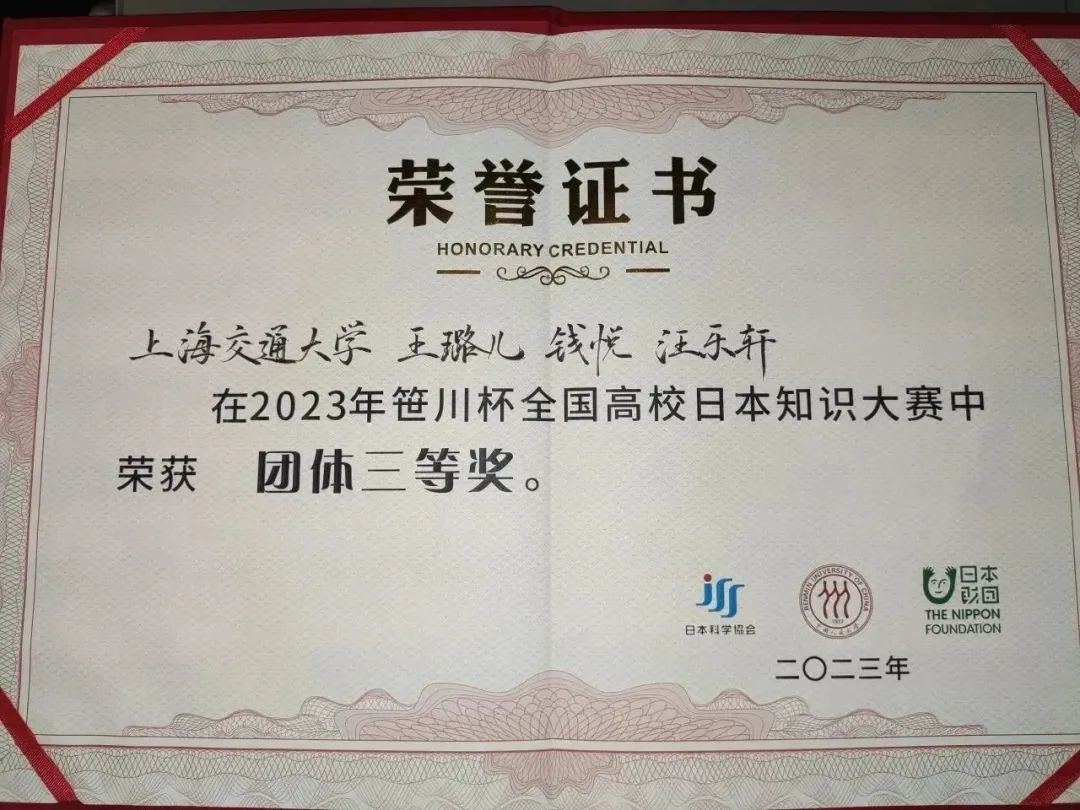 日语系2020级本科生王璐儿同学、2021级本科生汪乐轩同学、2022级本科生钱悦同学在林子博老师的指导下,代表上海交通大学在本届比赛中以优异表现荣获团体三等奖。
