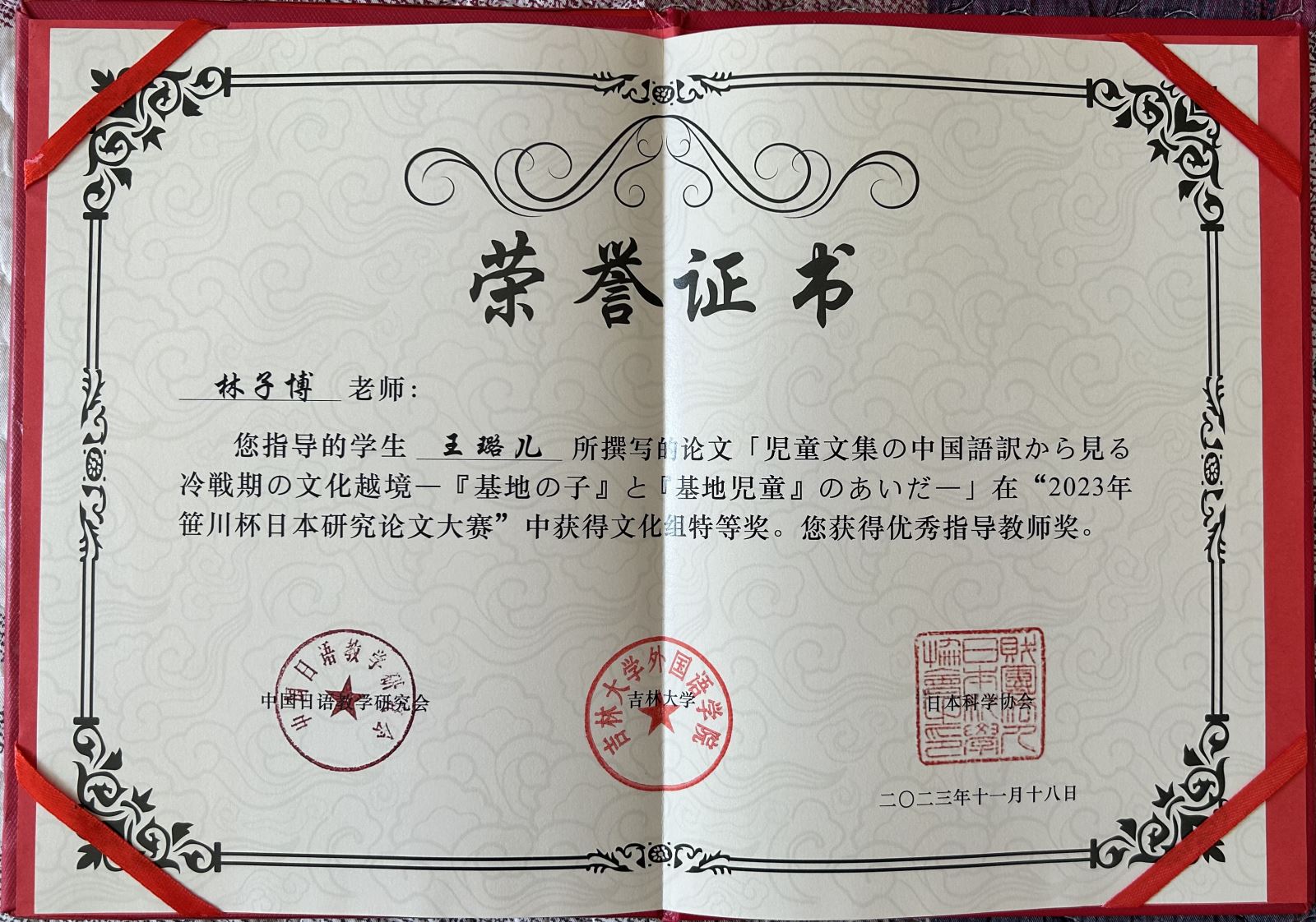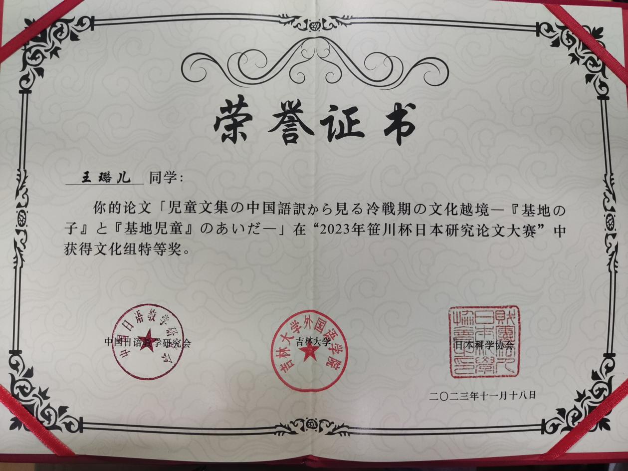 王璐儿同学的参赛论文《児童文集の中国語訳から見る冷戦期の文化越境-『基地の子』と『基地児童』のあいだ-》是林子博老师指导的第23期校级大学生创新实践计划项目《建国初期日本儿童报告文学在中国的译介研究》的结项成果之一,该研究从翻译史与教育史的视角出发,以生活作文集《基地儿童》的日文版和中译本为切入点,探究新中国建国初期日本儿童文集在国内的译介,以此考察冷战体系下中日文化交流史的一隅。王璐儿同学作为大创组组长,在每次组会中积极发言,引导大创组员定期整理和深化研究成果,最终形成了一篇2万余字的结项论文,在结项答辩时获得了评审老师的一致肯定。王璐儿同学的论文获奖,展示了我院大创制度在学生学术素养培养方面取得的切实成效。