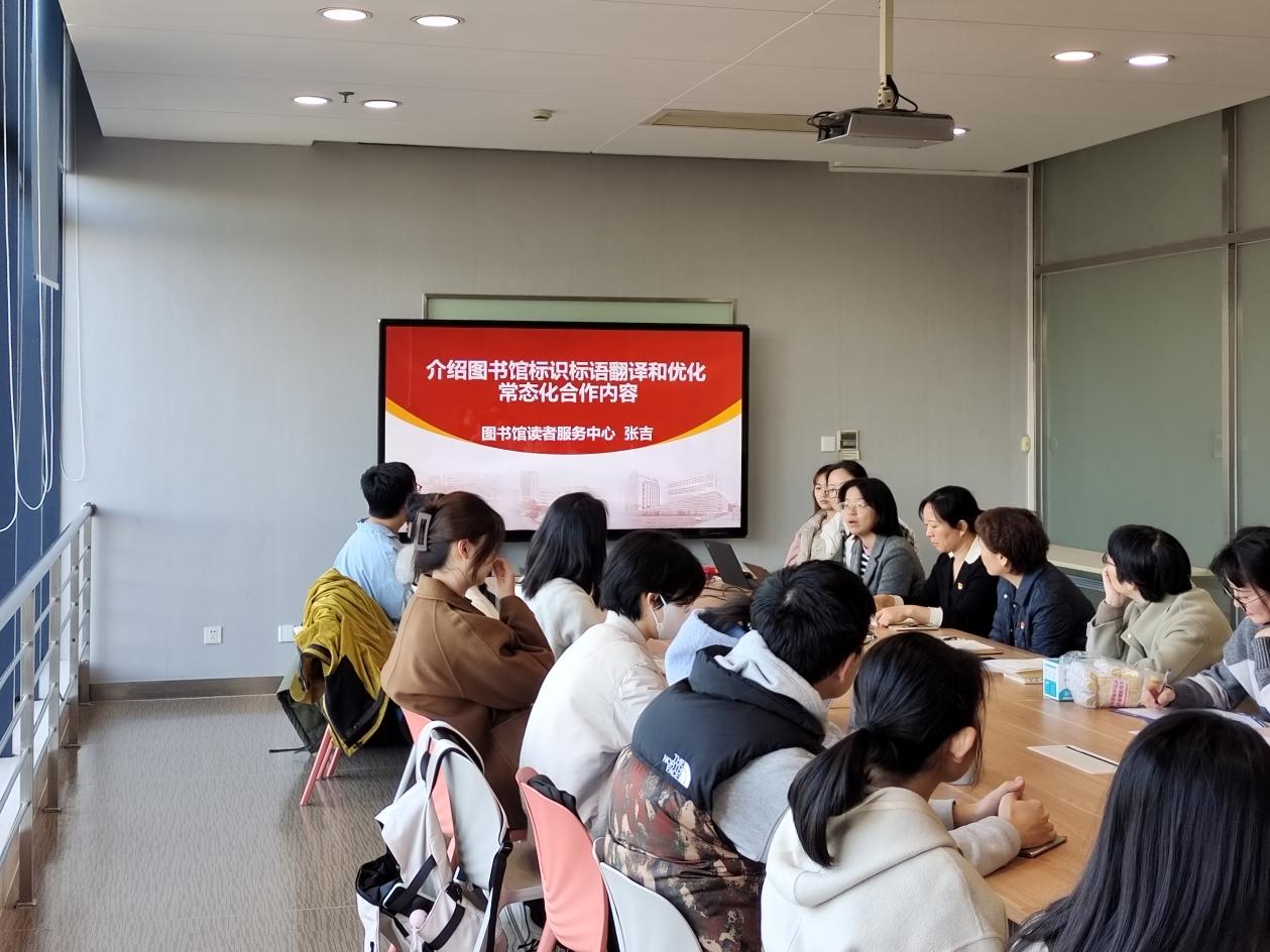 随后,图书馆读者服务中心副主任张吉介绍了本次合作共建的服务内容。她以一则图书馆标语的翻译实例为切入,介绍了标语优化工作专业化、创新化、国际化的重要意义,并愿同外院本科生联合党支部一道搭架起可持续、常态化的服务对接机制,吸纳更多奉献意识强、专业能力精的外院学生将青春才干回馈校园建设、师生福祉。