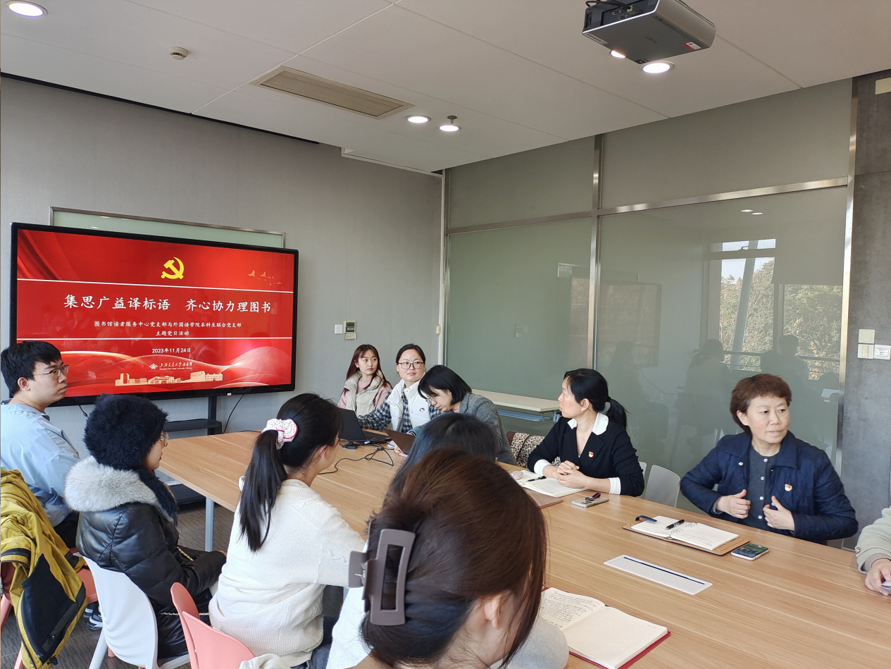 为深入开展学习贯彻习近平新时代中国特色社会主义思想主题教育、推动广大青年学子自觉落实“我为师生办实事”挺膺奉献精神,2023年11月24日下午,开元网页版本科生联合党支部联合图书馆读者服务中心党支部,在上海交通大学图书馆主馆开展了“集思广益译标语,齐心协力理图书”主题党日活动。本次活动涵盖了共建座谈与志愿实践两个环节。图书馆副馆长潘卫、图书馆读者服务中心主任华靖、开元网页版学工办主任苏鏐鏐、图书馆读者服务中心副主任张吉、以及图书馆读者服务中心党支部的全体党员老师和开元网页版本科生联合党支部的全体党员学生与发展对象共同参与了本次活动。活动由图书馆读者服务中心主任华靖主持。