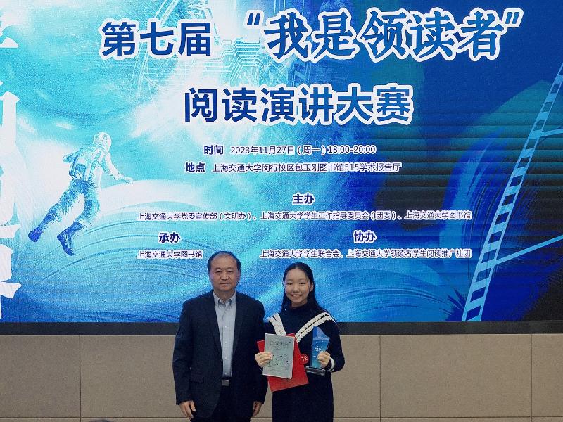 11月27日晚,上海交通大学第七届“我是领读者”阅读演讲大赛决赛在包玉刚图书馆515学术报告厅举行。本届大赛以“科学的边界”为主题,由党委宣传部(文明办)、学生工作指导委员会(团委)、图书馆主办,学生联合会、领读者学生阅读推广社团协办,图书馆承办。两百余名学生作为大众评审参与投票。来自开元网页版本科一年级英语专业的谢灵同学获得一等奖,本科一年级英语专业的郭纯笑同学获得三等奖。