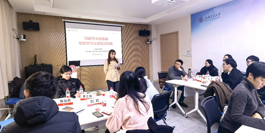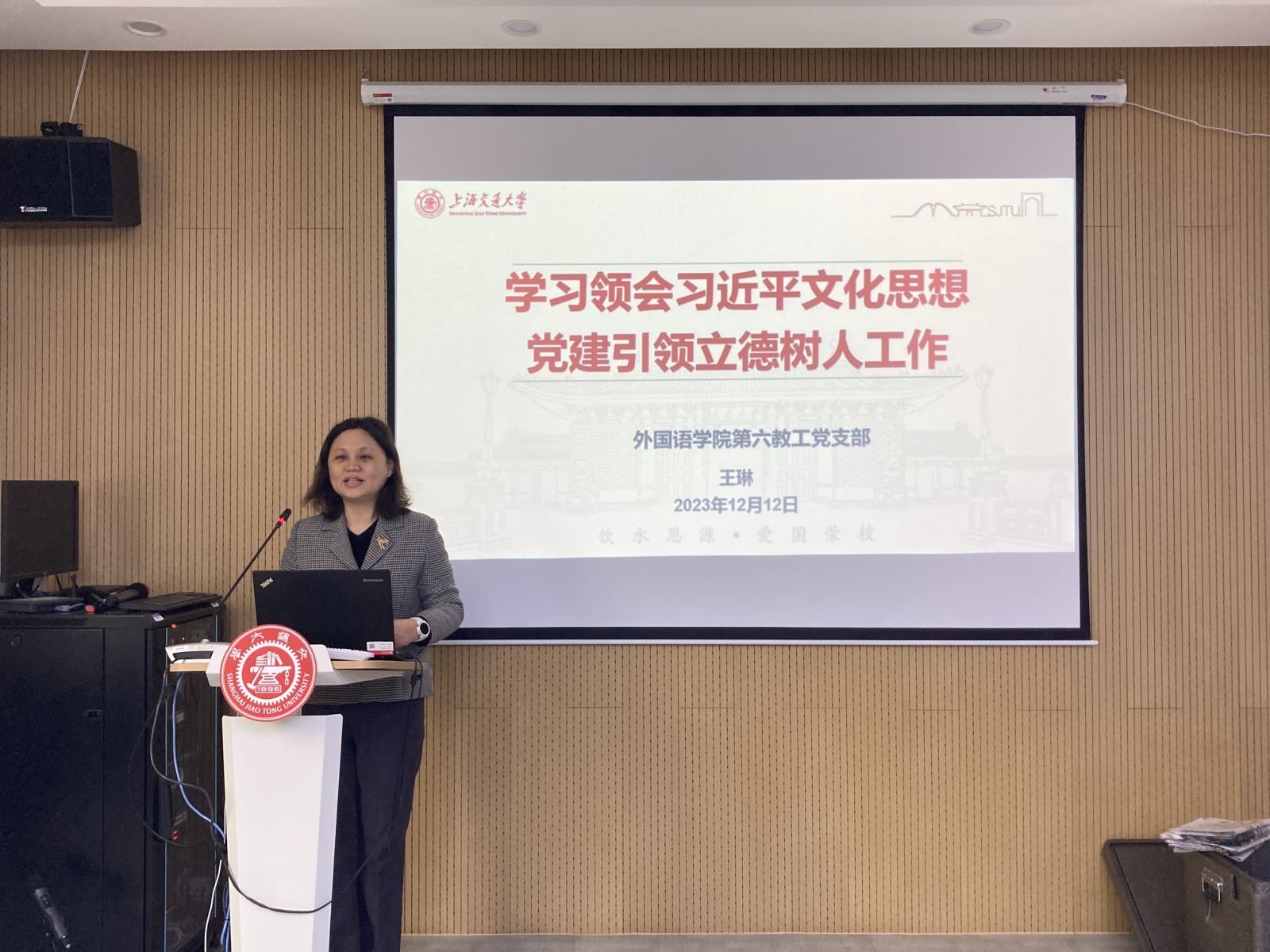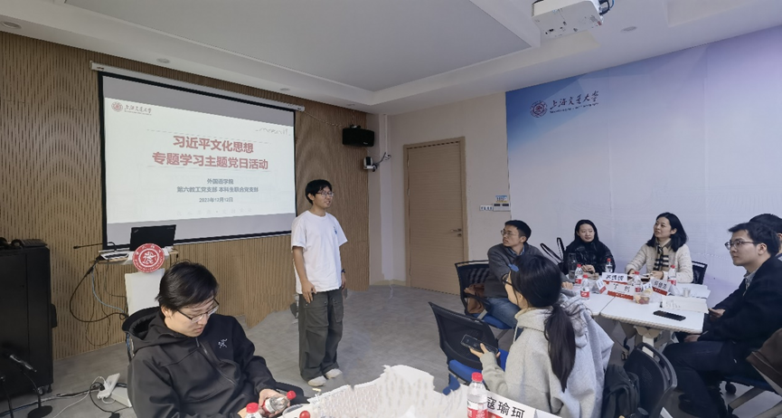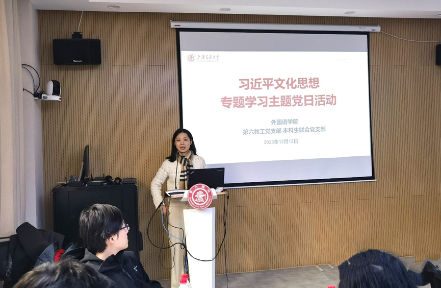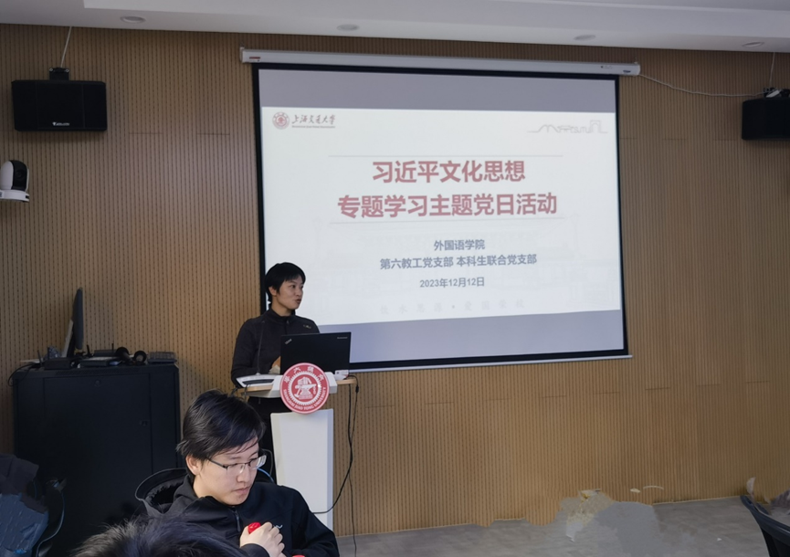 为了深入学习和贯彻习近平文化思想,2023年12月12日,第六教工党支部与本科生联合党支部在外语楼107举行“习近平文化思想专题学习”共建主题党日活动,马克思主义学院赖锐老师应邀为师生党员做了专题讲座,第六教工党支部、本科生联合党支部以及本科生入党积极分子35人参加了活动,活动由第六教工党支部书记王琳主持。