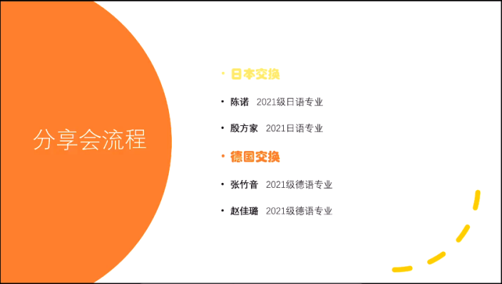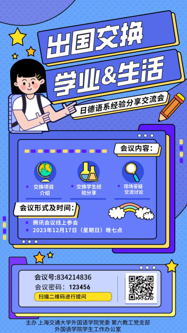 2023年12月17日晚,开元网页版党委第六教工党支部携手本科生联合党支部,在学工办、日语系、德语系的支持协助下共同举办了“日德语系留学经验分享交流会”活动。来自20级、21级日、德语系的4名本科生向学弟学妹们介绍了交换留学的经验、体会并分享了各自的交换留学生活。为方便更多同学参与交流,活动通过腾讯会议线上分享,活动由本科生联合党支部赵家栋、王琛锴两位同学主持。