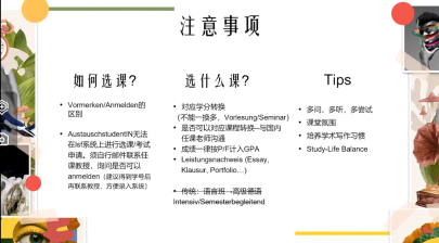 正在德国慕尼黑大学交换的21级德语系本科生张竹音同学首先介绍了交换留学项目的分类,包括院系交换项目和校际交换项目。她细致分享了交换申请的要点以及预约办理注意事项,还总结了在大学的选课、课程、考试类型以及语言班等方面的注意事项,也分享了出行、美食以及运动、生活方方面面的见闻和感触。