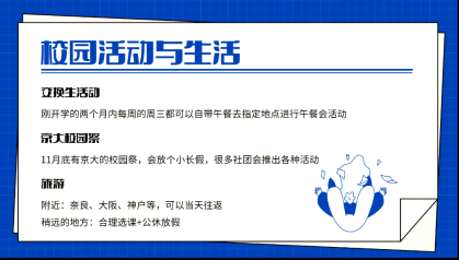 正在京都大学交换留学的21级日语系本科生陈诺同学首先介绍了该交换留学项目,还详细介绍了奖学金申请和选课相关的事项以及在日本交换留学的生活,包括衣食住行,提醒学弟学妹们要在出发前做好相关准备。之后还为大家分享了特色的校园活动,例如午餐会、校园祭、社团活动等。