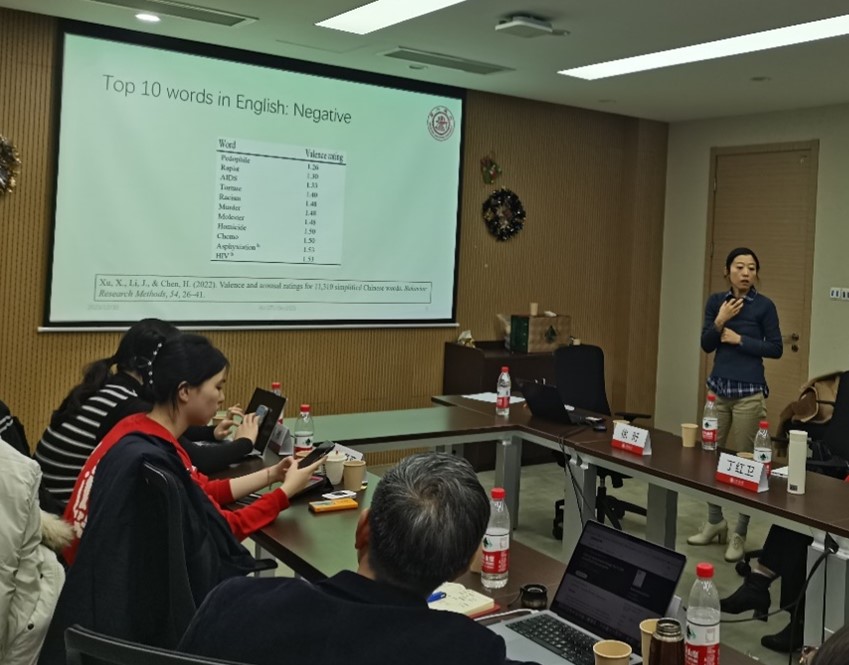 徐旴教授介绍了她所负责的词汇语义情感常模建立相关研究工作。她指出对词汇语义情感的分析,研究者得以探究个体或群体情绪情感表征的特点,及其与心理健康的关联。该研究结合计算模型对近四万中文词语的推演,制定了词汇语义情感常模,期待为情绪障碍下情感理解和交流机制的研究,及临床诊疗的实践,提供一项实用、可靠的工具。