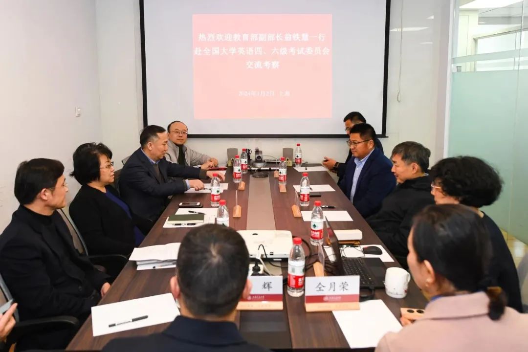 1月2日下午,教育部党组成员、副部长翁铁慧一行来校调研全国大学英语四、六级考试委员会。教育部考试院党委书记、院长李强,人事处处长石建华,财务处处长徐志芳,社会考试处副处长(主持工作)赵英华,上海市教委副主任王浩等陪同调研。上海交通大学校长、中国科学院院士丁奎岭,副校长张兆国在设立在交大的考试委员会办公室会见来宾一行并座谈交流。