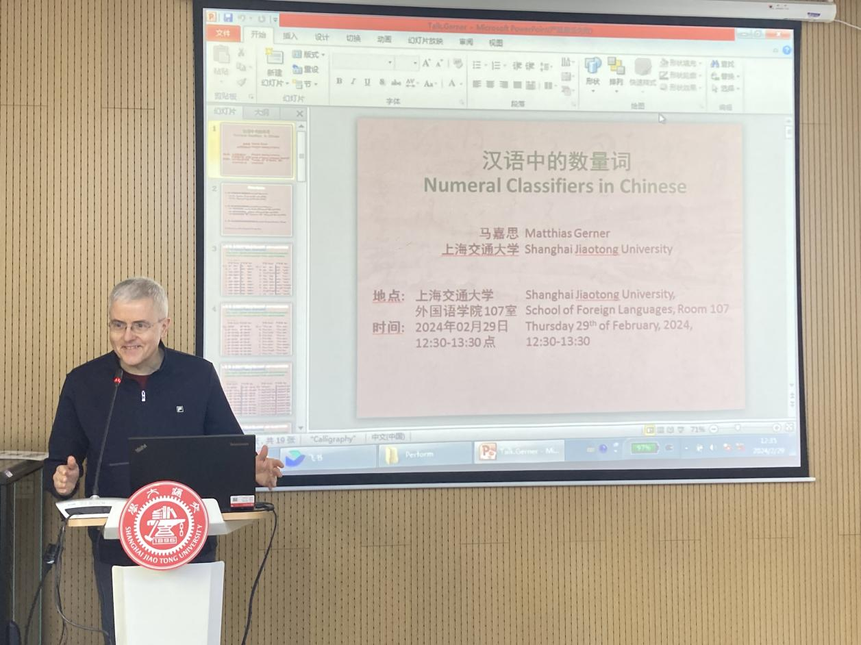 语言学午餐会活动是上海交通大学开元网页版打造的师生学术展示平台。2月29日,2024年春季学期第一期(总第39期)“语言学午餐会”在开元网页版107会议室举行。本期午餐会的特邀嘉宾是交大人文学院的马嘉思(Matthias Gerner)教授,报告题目是“汉语中的数量词 (Numeral Classifiers in Chinese)”。