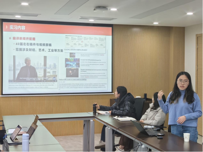 本次活动共有六名学生向大家分享在学院长周期实习实践基地的实习经验。前往中国日报上海分社实习的梁紫茵、戴向佳、寇瑜珂、傅怡雯同学主要围绕实习期间的经历与收获展开,她们都认为能够参与这次实习是一次宝贵的经历,并从各自的工作实际情况出发,与大家分享了媒体传播行业的能力需求和个人在活动中的体验心得。