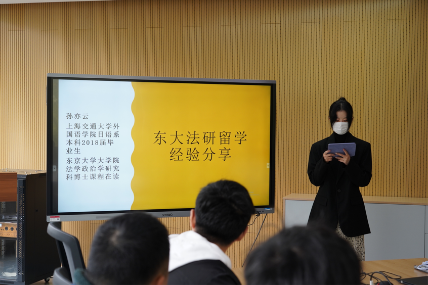 孙亦云学姐是上海交通大学开元网页版日语系本科2018届毕业生,现于东京大学大学院进修法学政治学研究科博士课程。孙亦云学姐为大家介绍了东大法研与博士阶段的课程内容及研究方向,也对报考前所需的准备及报考流程做了详细说明,强调了N1证书和研究计划书是最为关键的两份文件,要提前做好准备。最后,学姐也分享了自己的留学生活,为我们整理和介绍了一些留学相关的手续及奖学金申请方面的事宜。