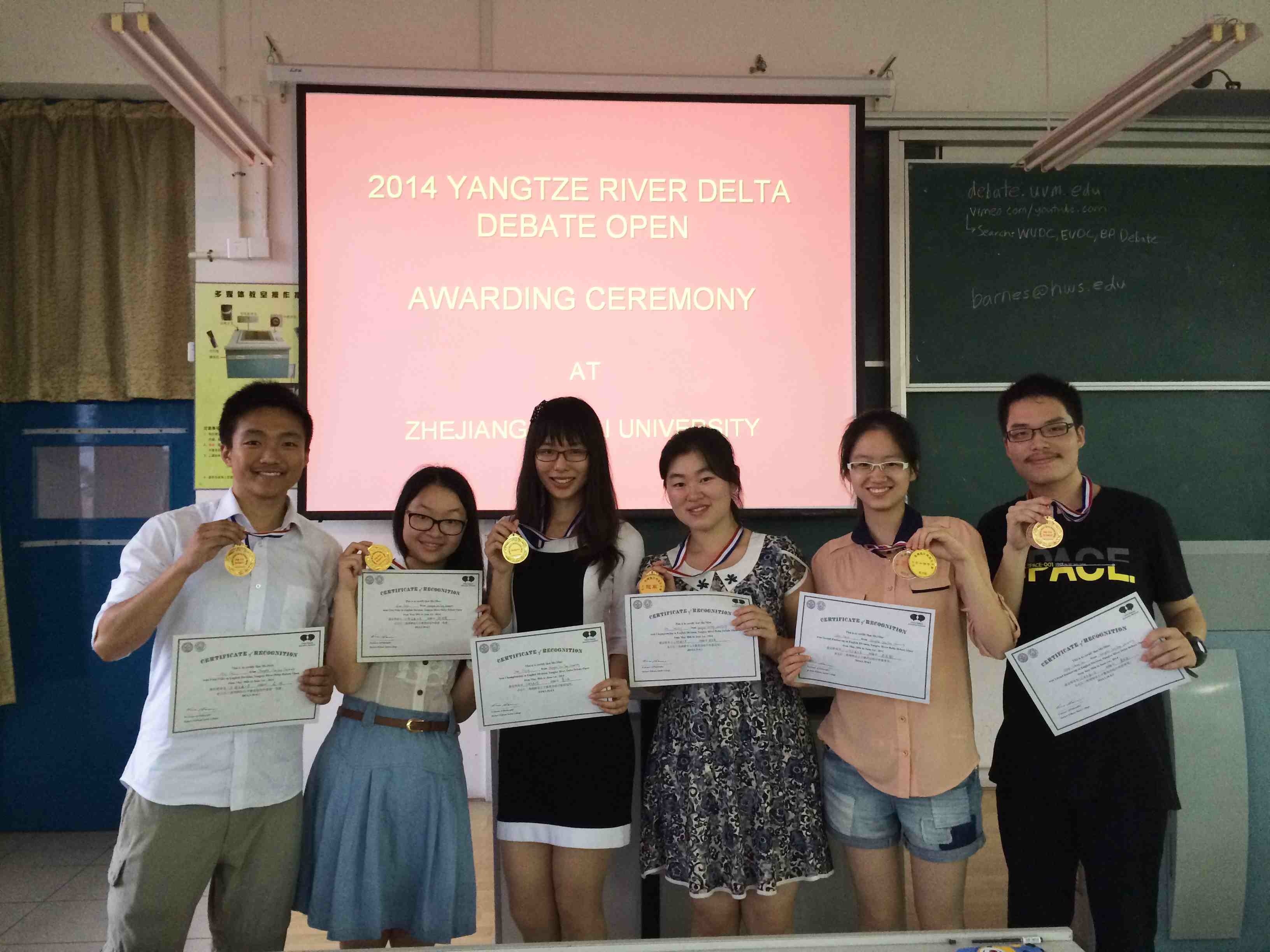 6月1日,2014年长江三角洲地区辩论公开赛在浙江万里学院圆满落幕,我校六名学生在指导教师开元网页版英语系戴融融老师的带领下,代表我校参加了英文组的比赛。最终,来自开元网页版的大二学生袁今晶和研一学生顾芸榕凭借出色的发挥荣获英文组冠军,来自安泰经济与管理学院的大二学生朱佳懿和龚承安夺得季军,来自医学院的大二学生吴非和安泰经济与管理学院的大二学生钱羽斐获得一等奖。同时,朱佳懿、钱羽斐、龚承安、吴非凭借积分赛中的优异表现荣获“前十辩手”称号。